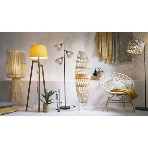 Maisons Du Monde Lampadaires Lampadaire En Bois De Manguier Et Abat-jour En Lin Et Rotin Beige H166