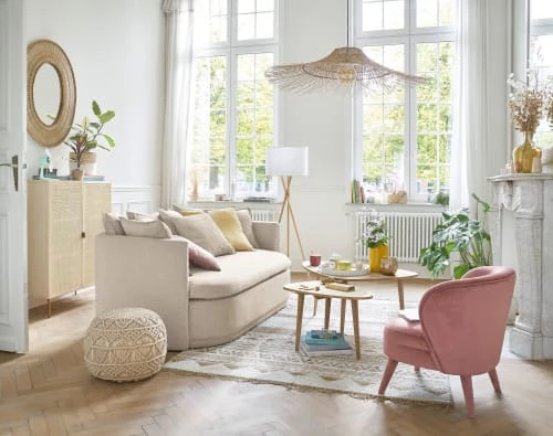 Maisons Du Monde Lampadaires Lampadaire En Bois De Manguier Et Abat-jour En Lin Et Rotin Beige H166